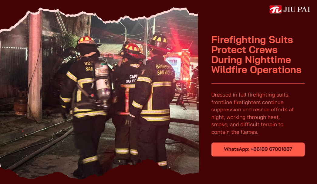 The Chilean wildfires are still raging, but relief efforts across the country never let up. Firefighters, the military, volunteers, and community organizations work closely together on the front lines around the clock, demonstrating a high degree of professionalism and selflessness.Frontline rescue is not only a test of skills and physical strength, but also a challenge to psychological and teamwork ability. With the efficient protection provided by JIUPAI firefighting uniforms, firefighters are able to safely and continuously engage in firefighting and rescue operations in high-risk environments, maximizing their own safety, while doing their best to protect residents and property.